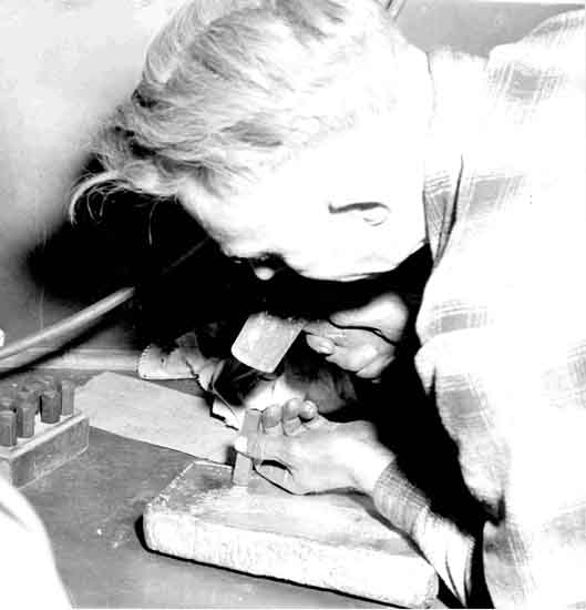 Harold Berg inscribing gold brick from Cariboo Gold Quartz Mine. 1 photograph : mounted on cardboard backing : b&w ; 8 x 7.6 inches. Copy positive.