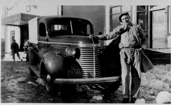 Unidentified man and truck in front of a building to the right of the Sunset Theatre. Two unidentified men in the background. One photograph : b&w : copy made by R.Candy ; 11.5 x 7 cm.
