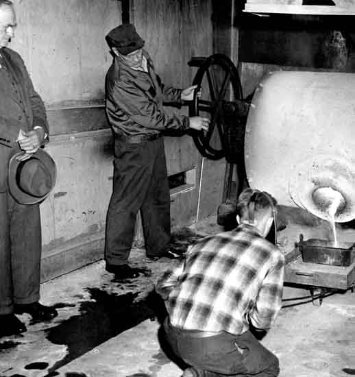 O.H. Solibakke watches as two men assist in pouring gold brick. The man wearing a hat is possibly John Stone. The man in a checkered shirt is possibly Harold Berg. 1 photograph : b&w ; 7.6 x 8.2 inches.