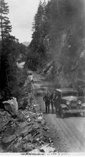 Gordon McArthur and John Leonard travelling to Wells, through Devil's Canyon. One photograph : b&w ; 5.5 x 3.25 inches. Collection of photographs donated by Dave Johnson (wp-200-307) and date between 1930 and 1941