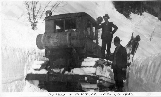 Snowplow use to clear the roads of the Cariboo Gold Quartz Mine. Fred Wells is in the foreground. Written on the front "On road to C.G.Q. March, 1933". Written on the back of the photograph "On road to C.G.Q. Mine 1932-1933, Fred Wells in foreground". One photograph : b&w ; 5.5 x 3.25 inches. Collection of photographs donated by Dave Johnson (wp-200-307) and date between 1930 and 1941