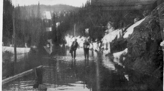 Barkerville Highway, between Wells and Stanley. Written on the back of the photograph 'En route to Wells from Stanley, May 14, 1933. On the way to Wells!" One photograph : b&w ; 4.5 x 2.75 inches. Collection of photographs donated by Dave Johnson (wp-200-307) and date between 1930 and 1941
