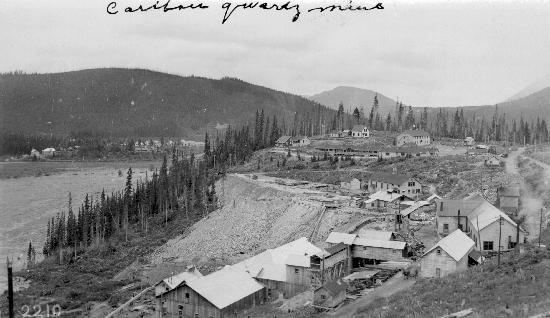 Cariboo Gold Quartz Mine in the foreground.To the left in the background is the Wells townsite. Number on left hand bottom corner reads "2210". "Cariboo Quartz Mine" is written in ink on the top of the photograph. "Cariboo Gold Quartz Complex" printed in pencil on the back of the image. 1 photograph : b&w ; 3.2 x 5.5 inches. Collection of photographs and postcards donated by Ernest Bell, wp00308-342. Photographer unknown, photographs taken in Wells and surrounding area.