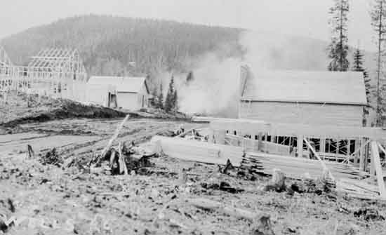 Wells, 1934. Printed in pencil on the back of the postcard is "When it started 1934, Town at Cariboo Gold Quartz and Island Mountain Mines" Possibly Pooley Street under construction. Postcard backing label reads "Made in Canada". 1 postcard : b&w ; 3.25 x 5.3 inches. Collection of photographs and postcards donated by Ernest Bell, wp00308-342. Photographer unknown, photographs taken in Wells and surrounding area.
