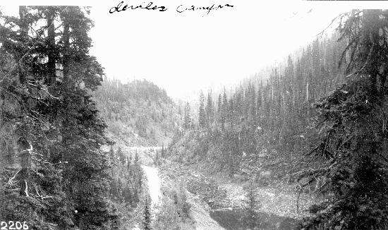 Devil's Canyon, outside Wells on the road to Quesnel. "2206" labeled on the bottom right hand corner. 1 photograph : b&w ; 3.25 x 4.25 inches. Collection of photographs and postcards donated by Ernest Bell, wp00308-342. Photographer unknown, photographs taken in Wells and surrounding area.