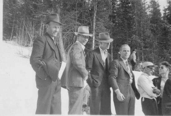 Six unidentified men standing on snow hill, dressed in suits. "Ski Club" identified on the back of the photograph. 1 photograph : b&w ; 2.5 x 3.5 inches. Collection of photographs and postcards donated by Ernest Bell, wp00308-342. Photographer unknown, photographs taken in Wells and surrounding area.