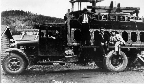 Bernard Gallie sitting in the cab of a truck. To the right, standing on the truck is Bob Vear, and to the far right is Colin McDougall and Pont Johnson on the end. One photograph : b&w ; 10 x 8 inches.