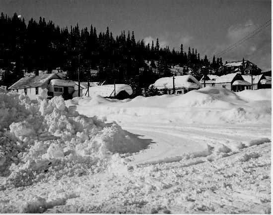 Townsite of Wells. Photograph facing the Wells Hospital and Island Mountain in the background. 1 photograph : b&w. Collection consists of photographs (wp603-611, 744, 896) donated by R.A.Luckow, child of A. (Fred) Luckow. Photographs were taken by Fred Luckow, who was "well known in Wells for a long time and would be remembered well by many people".