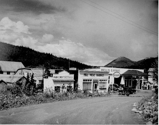 Pooley Street, Wells. Photograph shows the Hill Meat Market, Pacific Great Eastern Rly and the Wells Garage. 1 photograph : b&w. Collection consists of photographs (wp603-611, 744, 896) donated by R.A.Luckow, child of A. (Fred) Luckow. Photographs were taken by Fred Luckow, who was "well known in Wells for a long time and would be remembered well by many people".