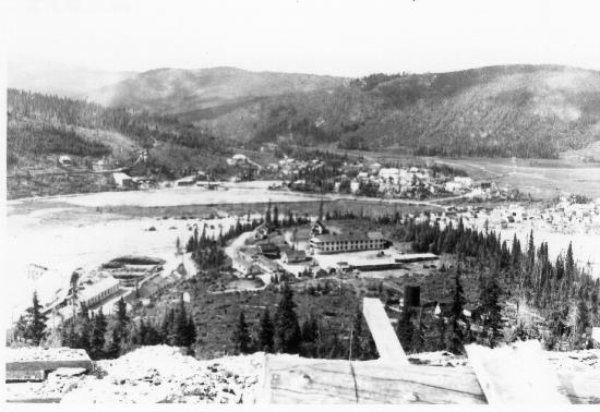 View of the Cariboo Gold Quartz Mine in the foreground. The Wells townsite is beyond the Mine, showing south Wells to the right. Island Mountain is in the background. 1 photograph : b&w ; 11.5 x 8 cm. Collection consists of photographs donated by Colin MacDonald (wp00562-566,586-591,618,625,631,647,655,660,663,664,680,696-701) photographer unknown. Photographs are predominately in the Wells area.