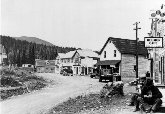 Pooley Street, Wells. Buildings identified are the Welmore Café on the immediate right and the Wells Hotel with the matching two peaks. 1 photograph : b&w ; 14 x 8 cm. Collection of photographs and postcards donated by Shirley Brown and Mrs. Frew (wp00341, 710-714, 747-752), photographer unknown. All photographs were taken in the Wells area, except one in Barkerville.