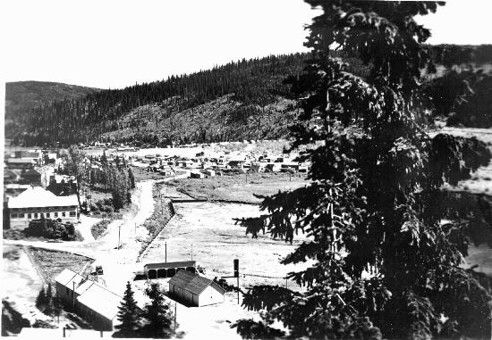 Wells Townsite,south end of town showing the tailings of the Cariboo Gold Quartz Mine. 1 photograph : b&w ; 17 x 11.5 cm. CCollection consists of photographs donated by Eric Johnson (wp00614,615,652,657,738,900-902,909,967-969) photographer unknown. Photographs taken between 1930-1941, predominately in the 1930s.