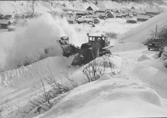 Rotary snowplow clearing the road between Barkerville and Wells, 1934. One photograph: b&w;
